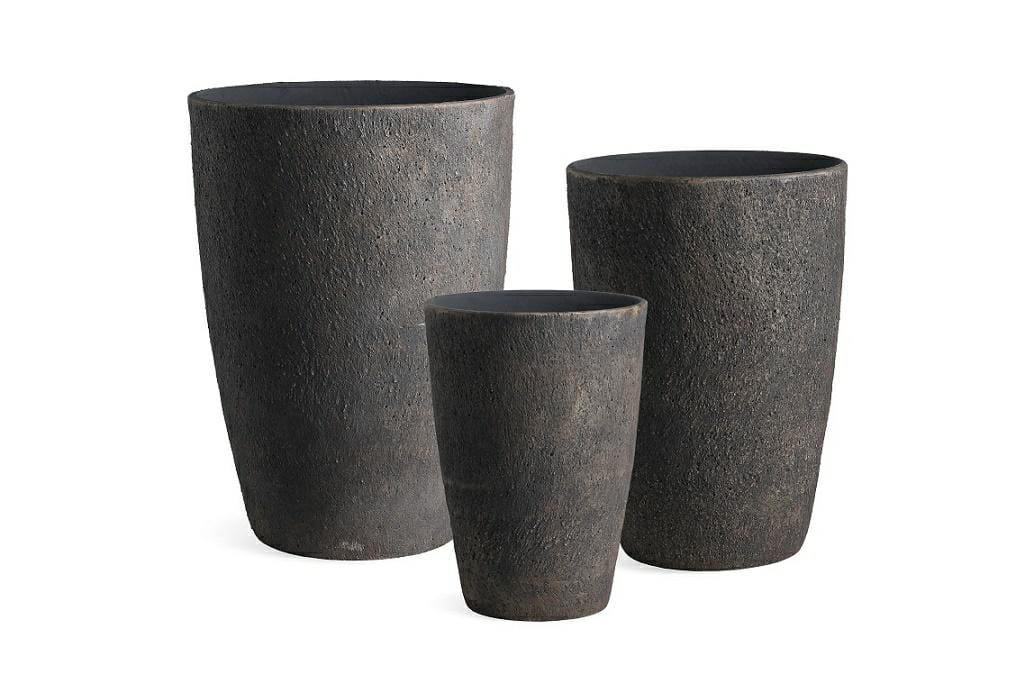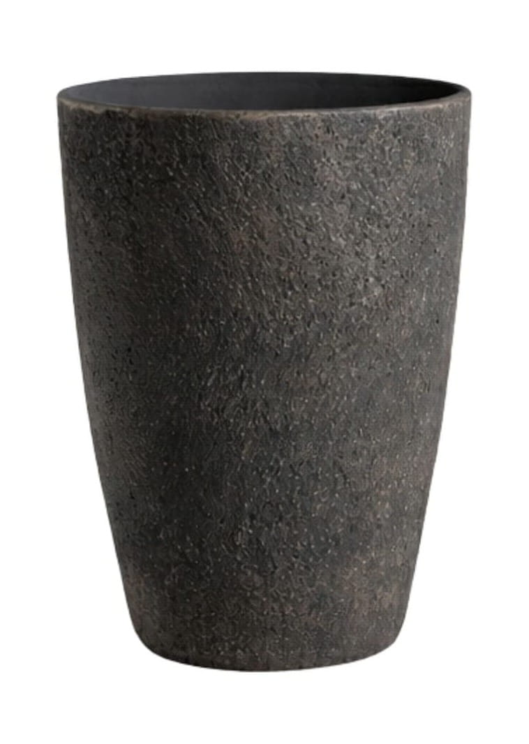 Donica wykonana z betonu o subtelnej, porowatej strukturze i ciemnym, brązowym wykończeniu. Jej prosta, lekko zwężająca się ku dołowi forma sprawia, że doskonale prezentuje się zarówno we wnętrzach, jak i na tarasie czy balkonie.