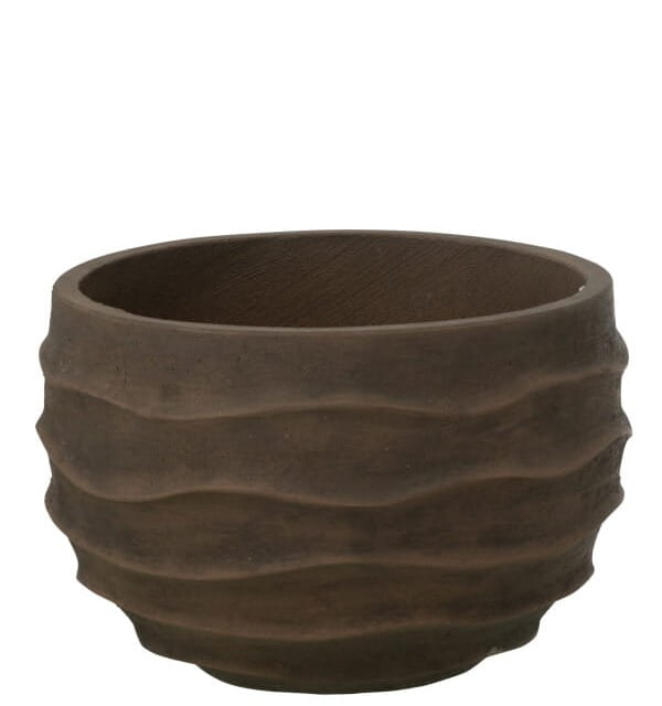 Stylowa donica wykonana z betonu w ciepłym, brązowym odcieniu z efektem postarzenia, który nadaje jej naturalnego i lekko surowego charakteru. Falowana, nieregularna struktura powierzchni inspirowana naturą tworzy ciekawy efekt wizualny i wyróżnia ją na tle klasycznych form.
