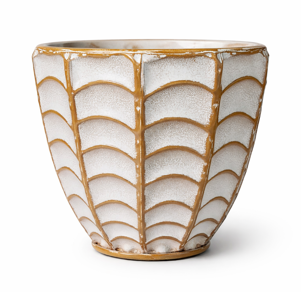 Donica wykonana jest z ceramiki i wyróżnia się dekoracyjnym, przecieranym wykończeniem, które nadaje jej lekko postarzany, a jednocześnie elegancki charakter. Jasna kolorystyka w połączeniu z ciepłymi, beżowo-złotymi akcentami oraz subtelnym, geometrycznym wzorem sprawia, że donica przyciąga uwagę i stanowi stylowy element wnętrza. Struktura powierzchni podkreśla jej unikalność i dekoracyjny wygląd.