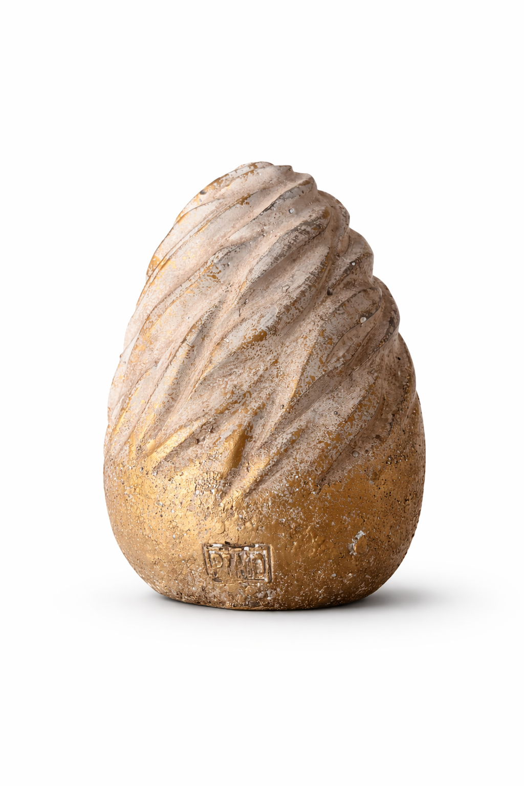 Dekoracyjne jajko betonowe wyróżnia się efektowną, ryflowaną powierzchnią, która nadaje mu wyrazistego i nieco artystycznego charakteru. Subtelne postarzane wykończenie podkreśla strukturę żłobień, tworząc dekoracyjny efekt inspirowany stylem vintage.