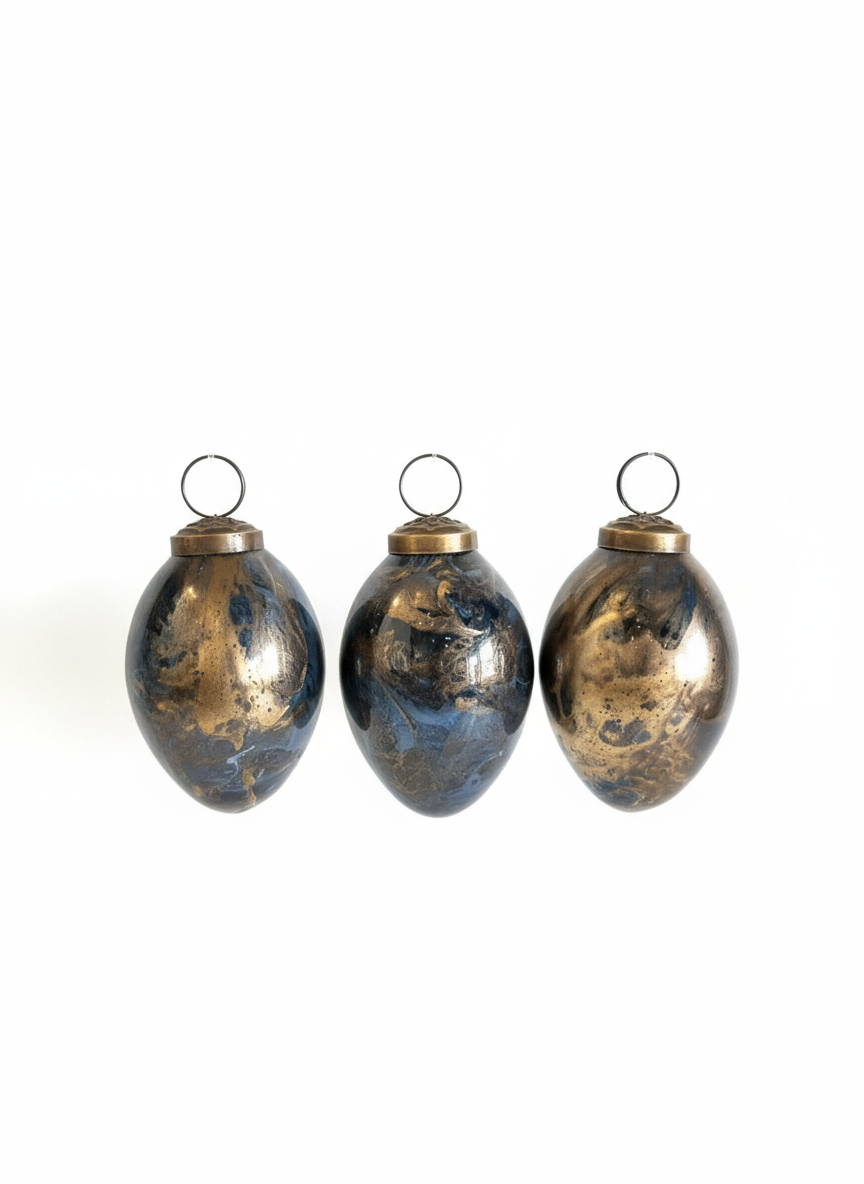 Dekoracyjne jajko wielkanocne o wysokości 10 cm to stylowy element świątecznej aranżacji, który łączy klasyczny symbol Wielkanocy z nowoczesnym, eleganckim wykończeniem. Marmurkowy wzór w głębokich odcieniach granatu i czerni przełamany złotymi akcentami tworzy efekt luksusowej, artystycznej dekoracji.