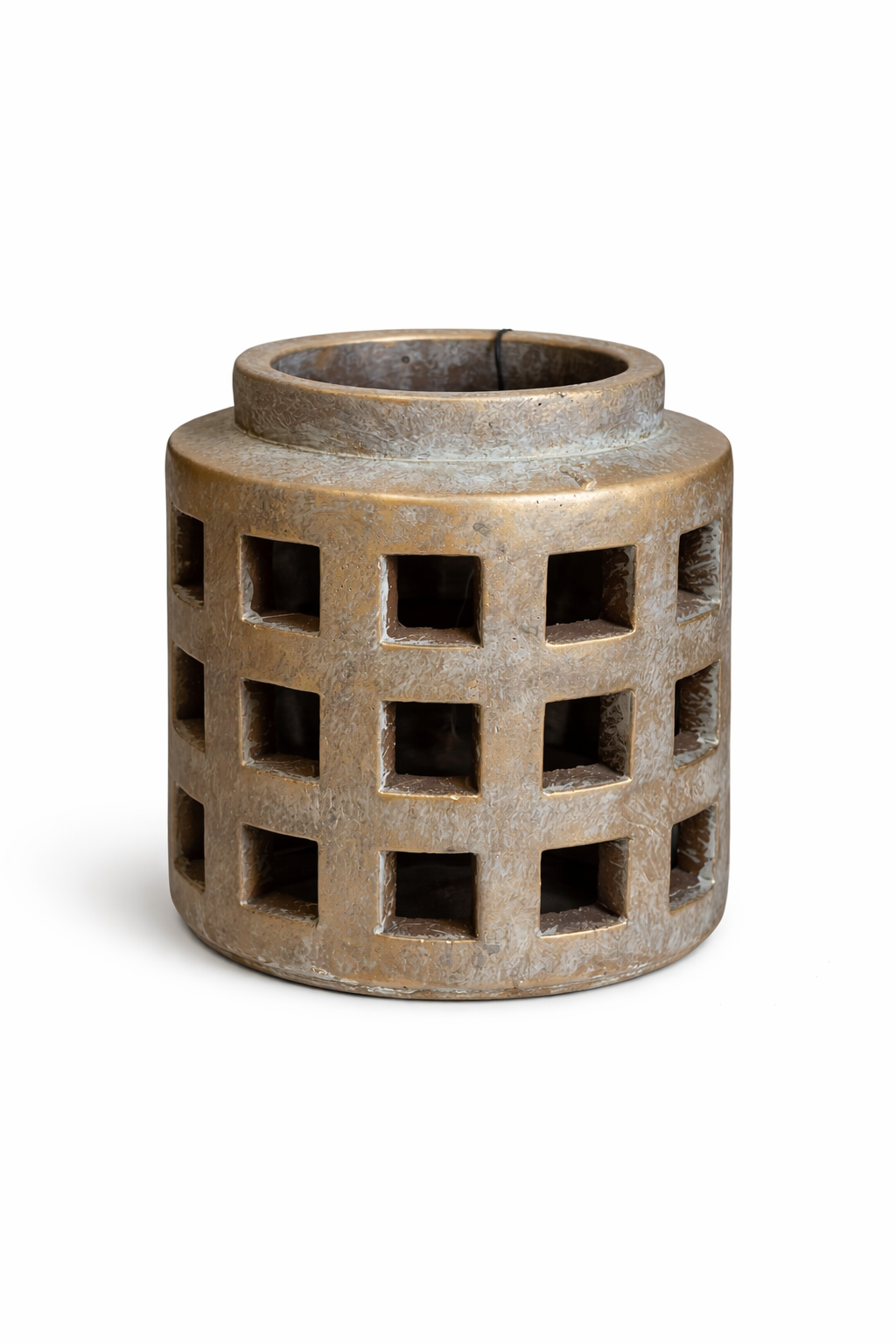Lampion wykonany z betonu wyróżnia się naturalną strukturą materiału oraz postarzanym wykończeniem, które nadaje mu wyjątkowy, rustykalny charakter. Delikatne przetarcia i nieregularna faktura podkreślają jego dekoracyjny wygląd, dzięki czemu lampion doskonale wpisuje się w aranżacje inspirowane naturą, stylem loftowym oraz rustykalnym.