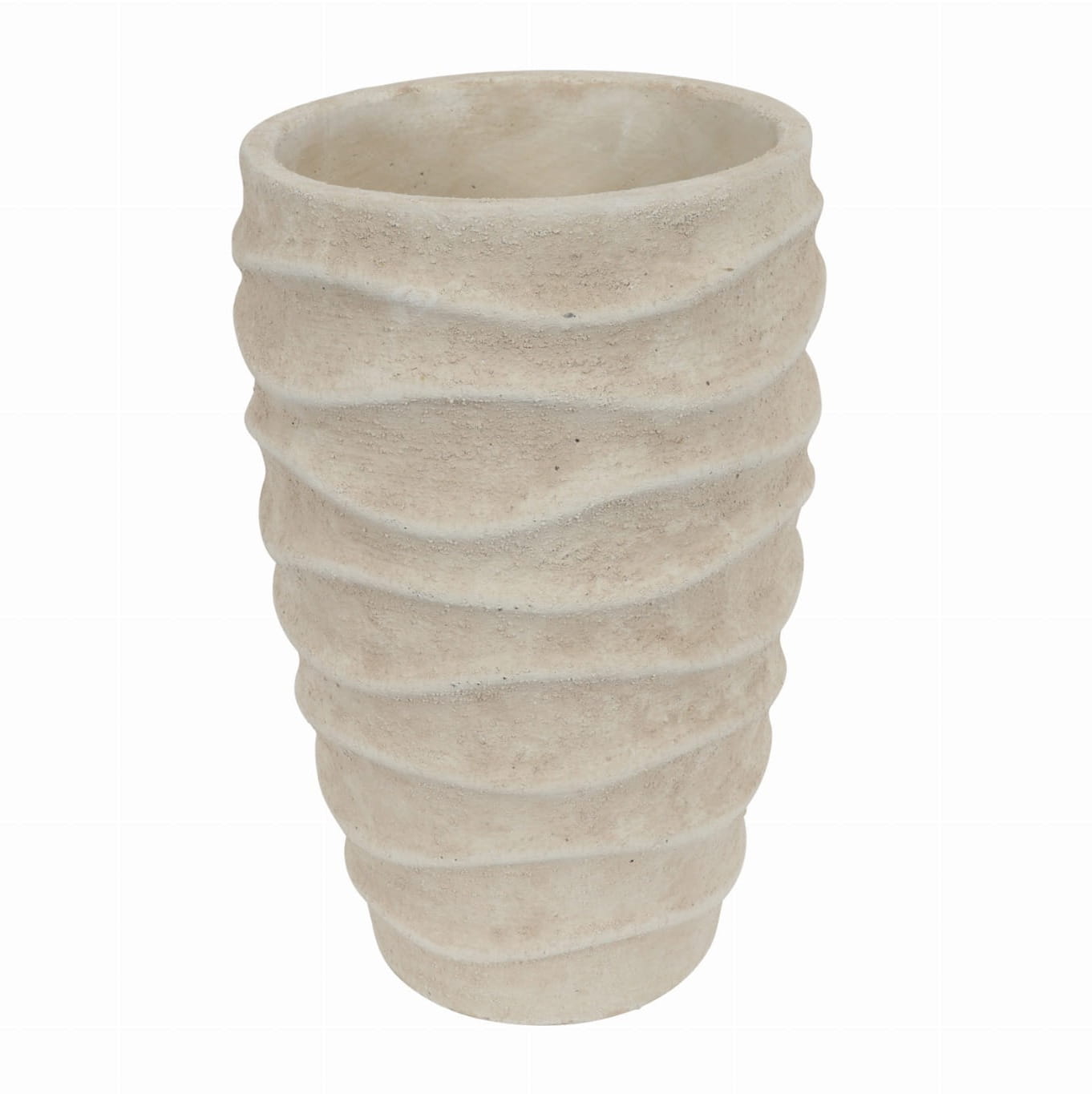 Osłonka wykonana z betonu wyróżnia się smukłą, wysoką formą oraz ryflowaną powierzchnią, która nadaje jej unikalny, dekoracyjny charakter. Delikatne, falujące żłobienia w połączeniu z postarzanym wykończeniem w odcieniach beżu tworzą efekt inspirowany naturą i ręcznym rzemiosłem.