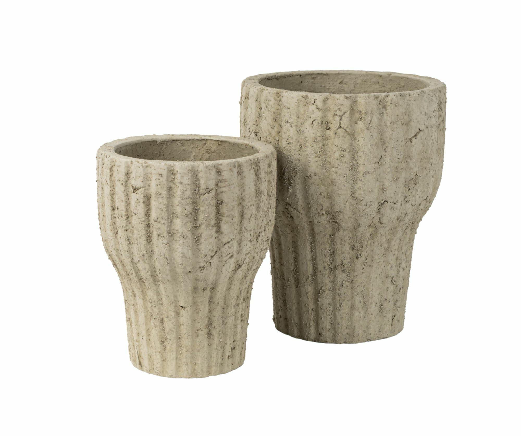Osłonka wykonana z betonu w jasnym, beżowym odcieniu z delikatnym efektem postarzenia. Jej charakterystyczna, prążkowana faktura oraz forma na nodze nadają całości wyjątkowego charakteru i sprawiają, że jest nie tylko praktycznym dodatkiem, ale również wyrazistym elementem dekoracyjnym.
