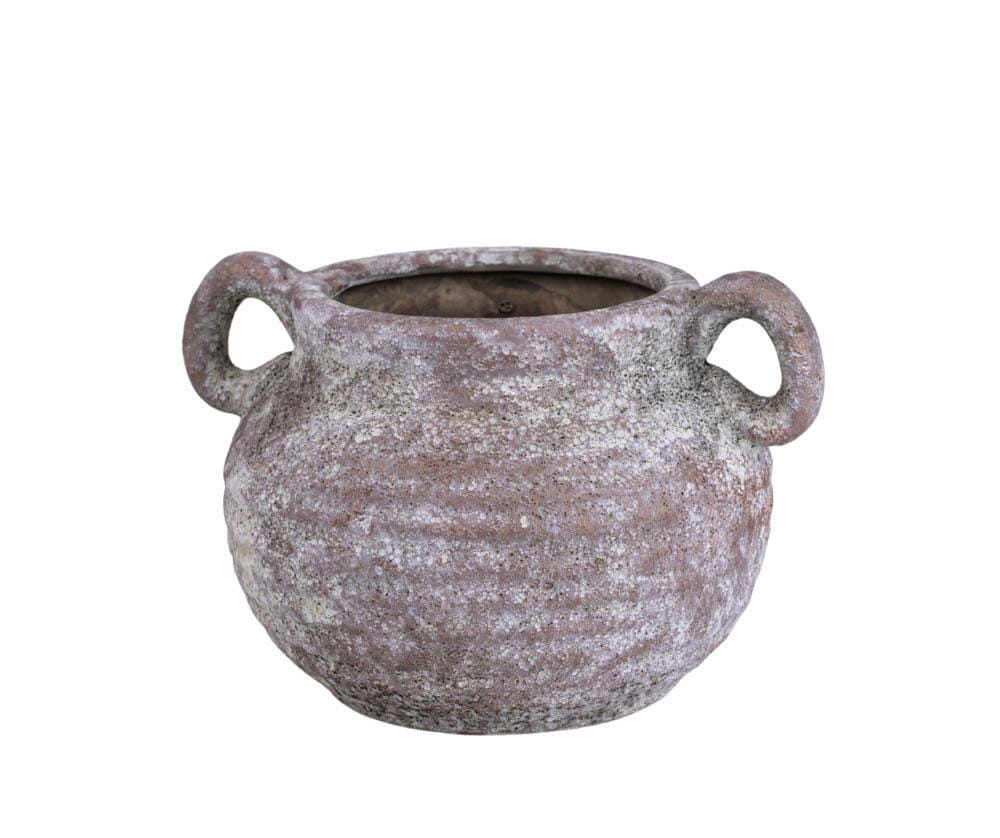 Dekoracyjna osłonka wykonana z betonu o wyrazistej, przecieranej strukturze i subtelnym efekcie postarzenia. Jej charakterystycznym elementem są boczne uchwyty, które nadają całości unikalny, lekko rustykalny charakter. Naturalna kolorystyka i nieregularna faktura sprawiają, że każda sztuka wygląda nieco inaczej.