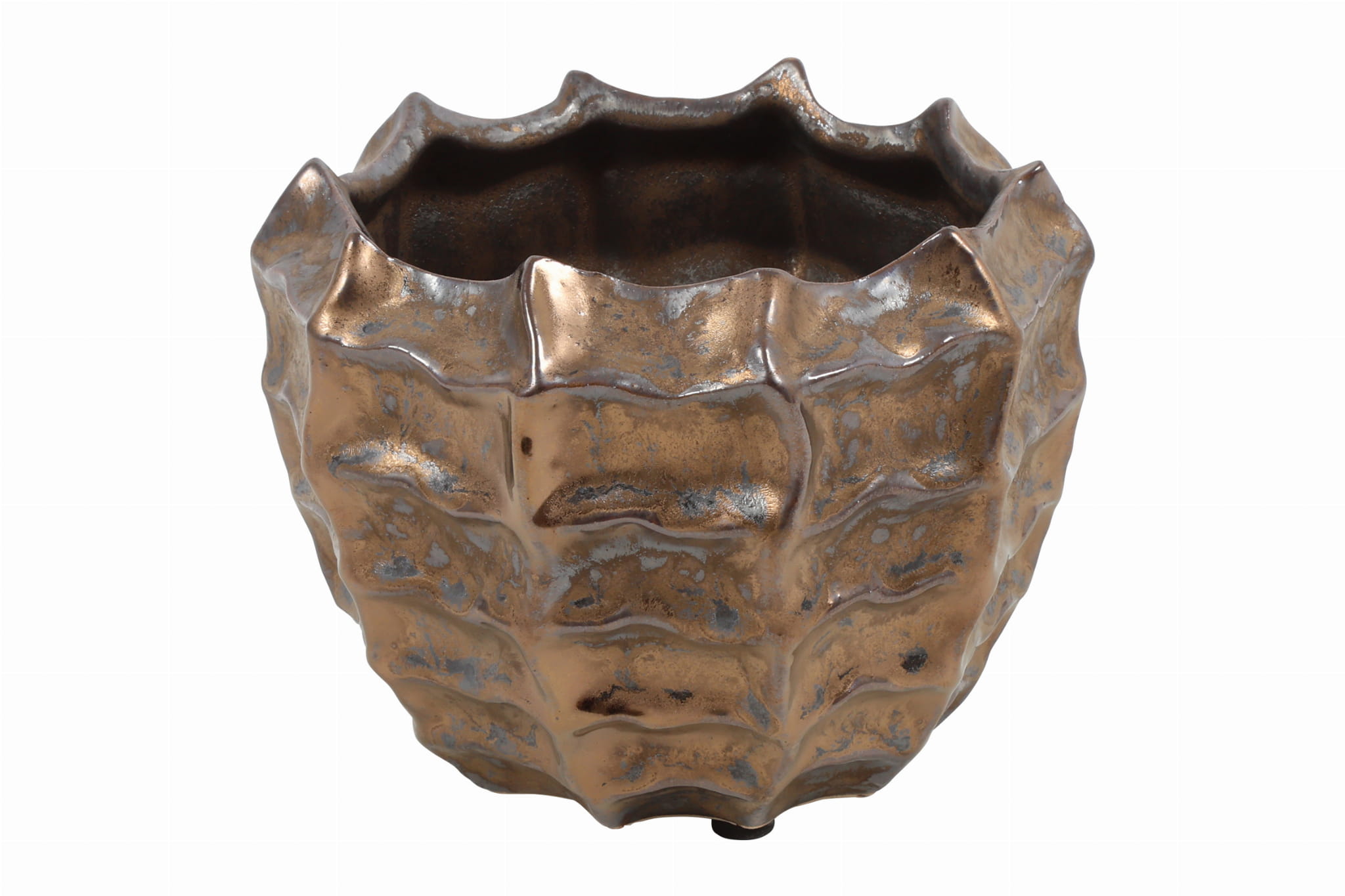 Osłonka wykonana z metalu wyróżnia się unikalną, nieregularną formą oraz efektownym, postarzanym wykończeniem w odcieniach brązu. Subtelne przetarcia i zróżnicowana faktura nadają jej charakter inspirowany naturalnymi procesami starzenia, dzięki czemu doskonale wpisuje się w aranżacje loftowe, industrialne oraz nowoczesne.
