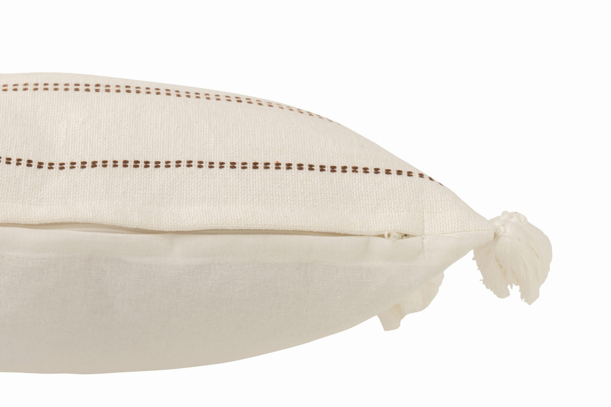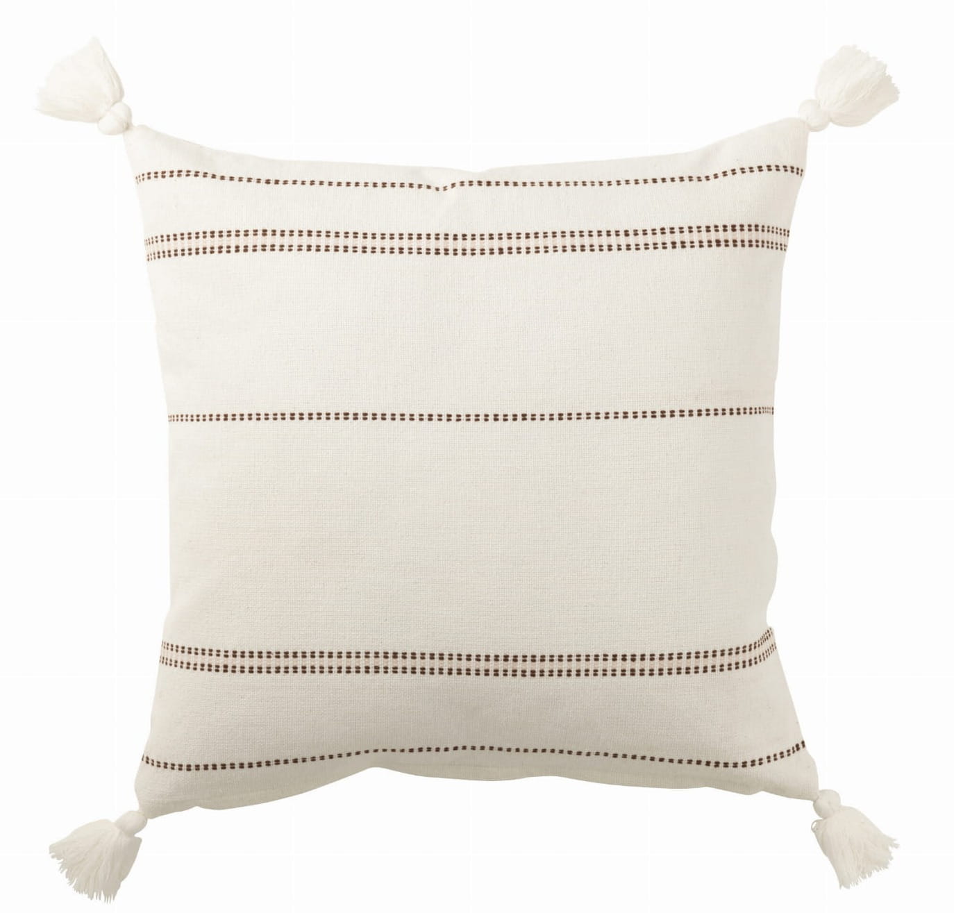 Frędzle umieszczone w narożnikach podkreślają styl poduszki i dodają jej przytulności, wpisując się w estetykę boho oraz naturalnych wnętrz. Dzięki stonowanej kolorystyce doskonale komponuje się z różnymi aranżacjami – od nowoczesnych po klasyczne i skandynawskie.