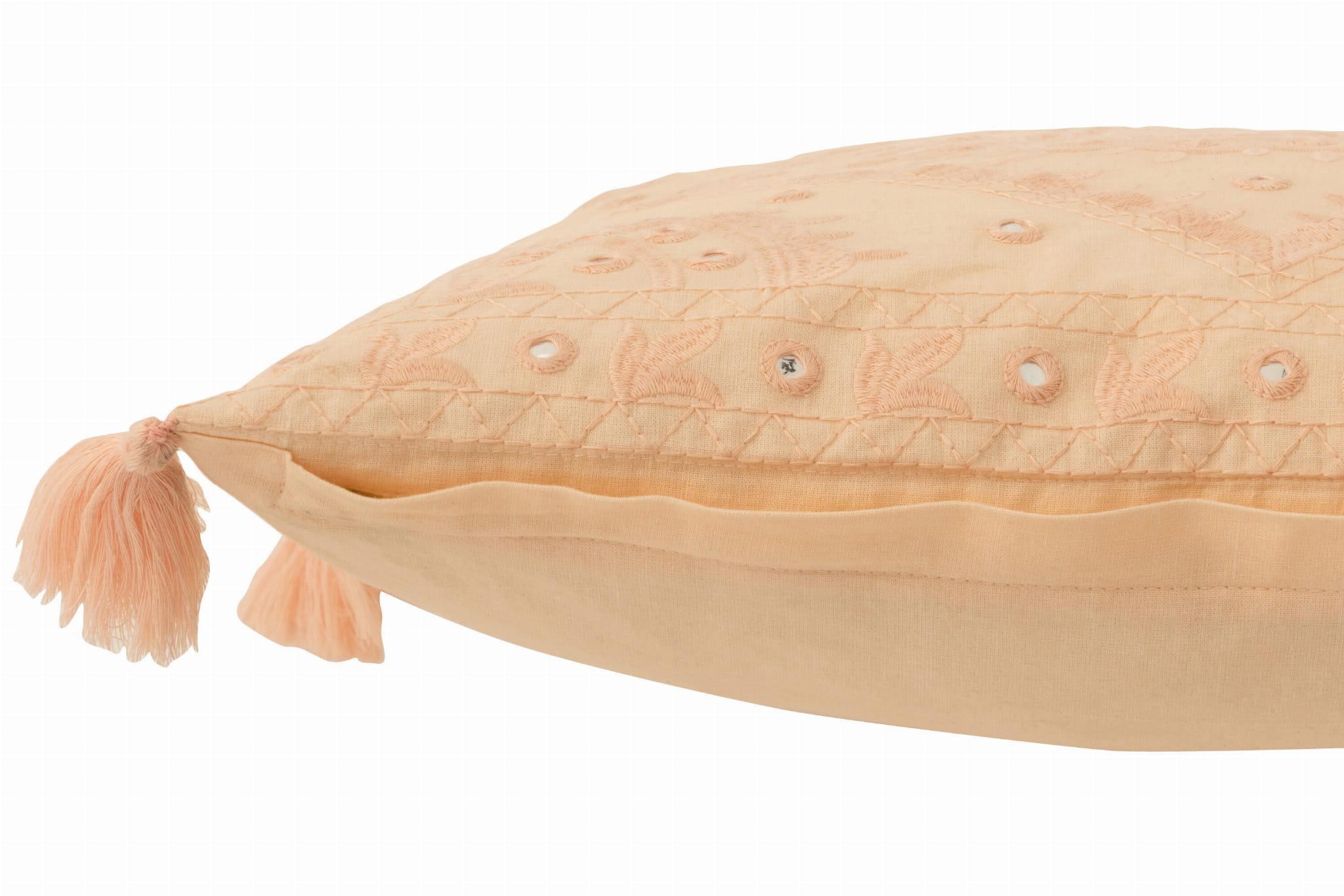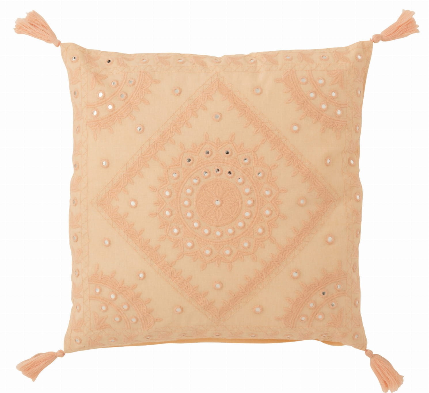 Stylowa poduszka dekoracyjna wykonana z bawełny w subtelnym, różowym odcieniu. Jej powierzchnię zdobi delikatny, ornamentalny wzór z ażurowymi detalami, który nadaje całości lekkości i elegancji.