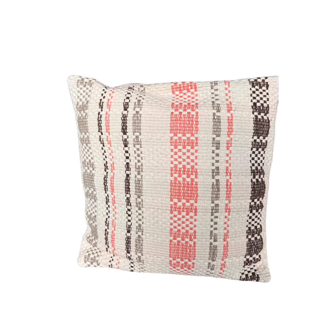 Wprowadź do swojego wnętrza nutę boho-chic dzięki tej ręcznie tkanej poduszce. Połączenie delikatnego różu oraz brązu na froncie doskonale ożywia każdego typu przestrzeń – od minimalistycznych salonów, przez sypialnie, aż po przytulne kąciki do czytania.