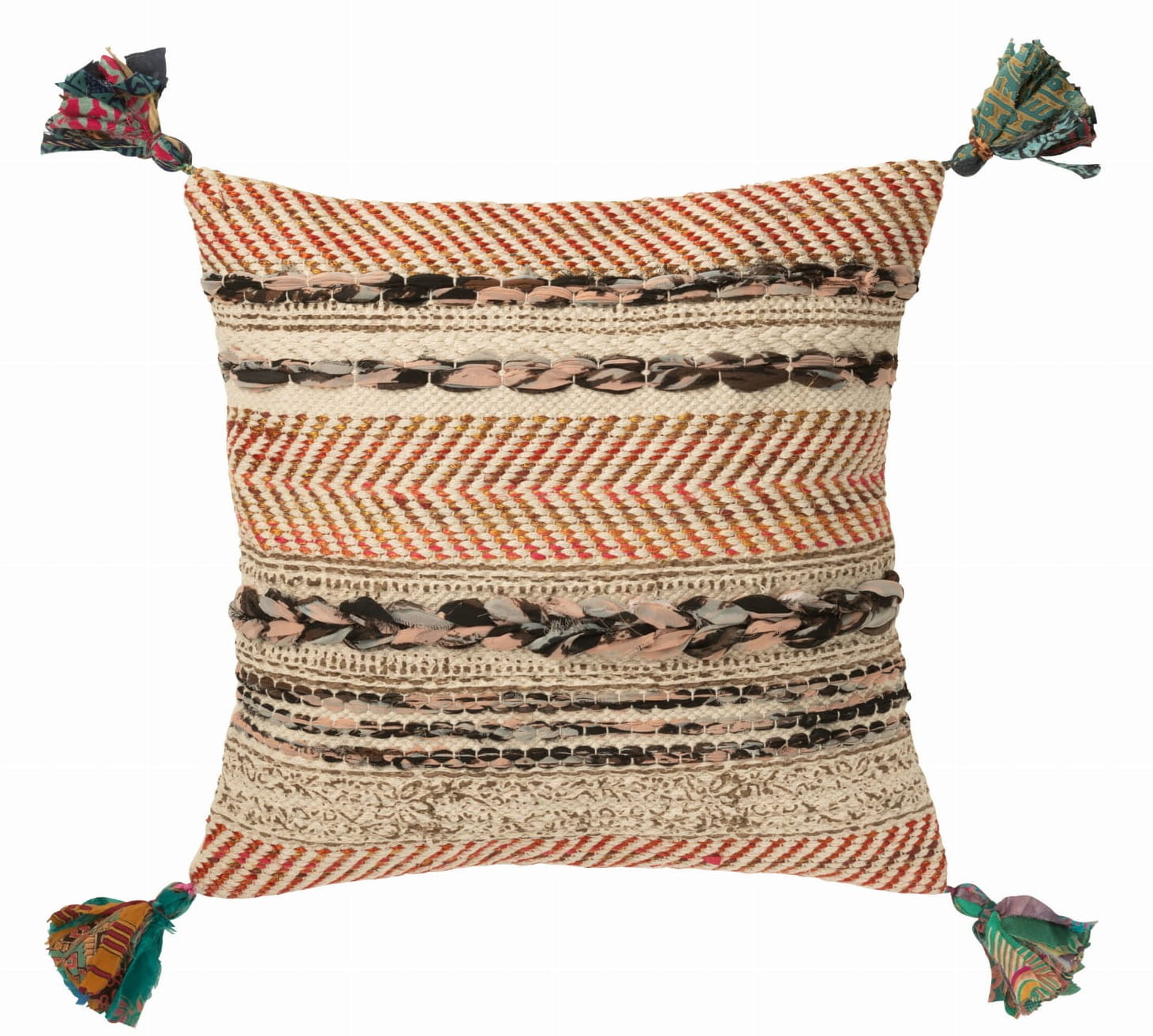 Kolorowe frędzle w narożnikach podkreślają jej styl i dodają lekkości, tworząc efektowny akcent dekoracyjny. Poduszka doskonale sprawdzi się we wnętrzach w stylu boho, etnicznym czy naturalnym, wprowadzając ciepło i przytulność.