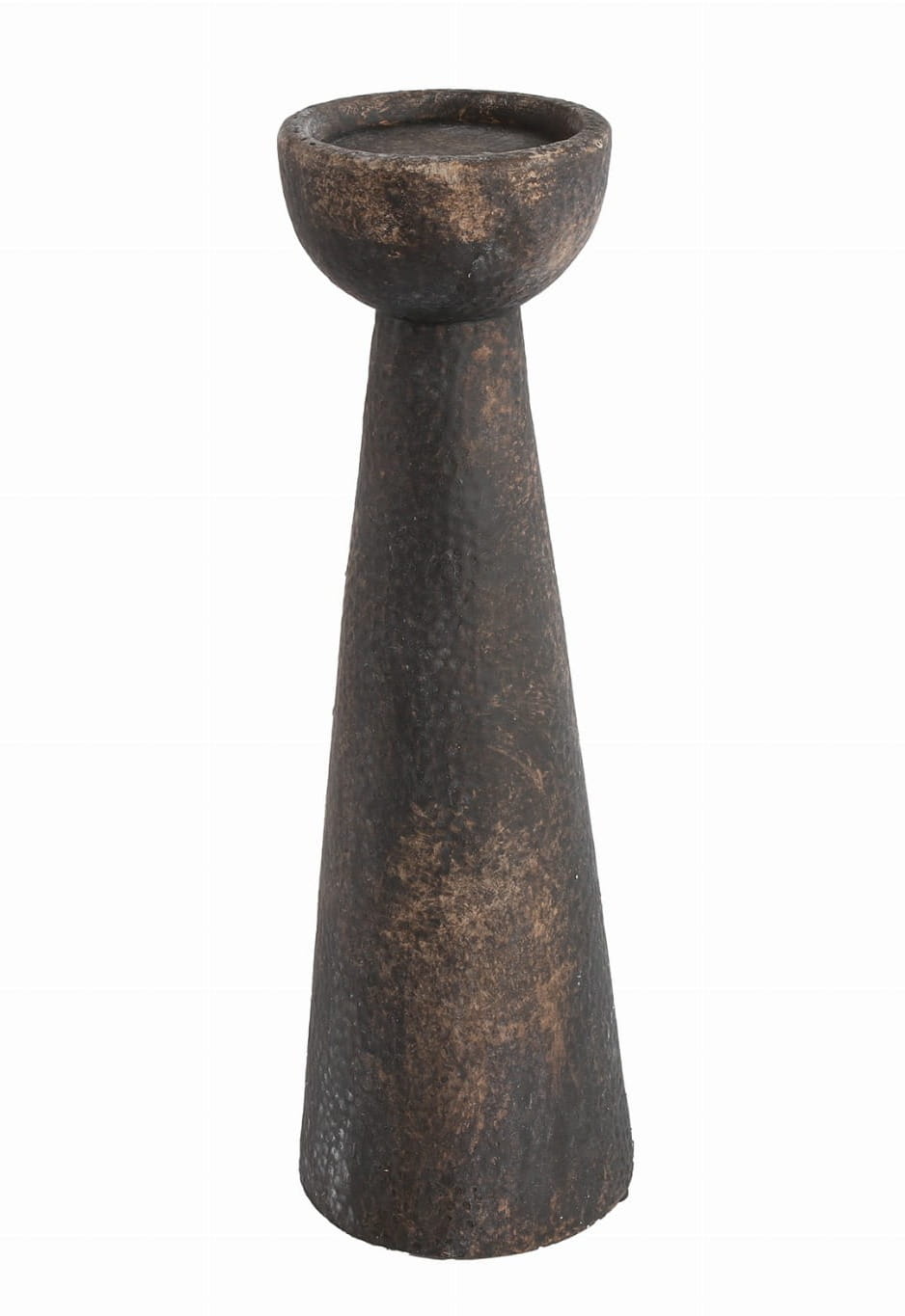 Świecznik wykonany z betonu wyróżnia się smukłą, dekoracyjną formą oraz postarzanym wykończeniem w ciepłym, brązowym odcieniu. Subtelnie nieregularna struktura powierzchni oraz delikatne przetarcia nadają mu wyjątkowego, lekko rustykalnego charakteru, który doskonale komponuje się z naturalnymi aranżacjami wnętrz.