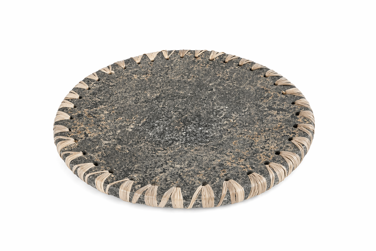 Taca wykonana została z materiału o betonowym wykończeniu, które nadaje jej surowy, a jednocześnie elegancki charakter. Przecierana powierzchnia w naturalnych odcieniach szarości tworzy efekt lekko postarzany, podkreślający dekoracyjny styl produktu. Charakterystycznym elementem jest ozdobne przeszycie na obrzeżu, które nadaje tacy unikalnego, rękodzielniczego wyglądu i wyróżnia ją na tle klasycznych dekoracji.