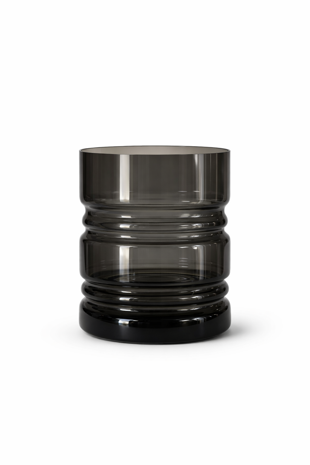Elegancki wazon wykonany ze szkła wyróżnia się przydymionym, grafitowym odcieniem oraz nowoczesną, geometryczną formą. Charakterystyczne poziome żłobienia w dolnej części nadają mu wyrazisty wygląd i sprawiają, że światło subtelnie odbija się od powierzchni szkła.