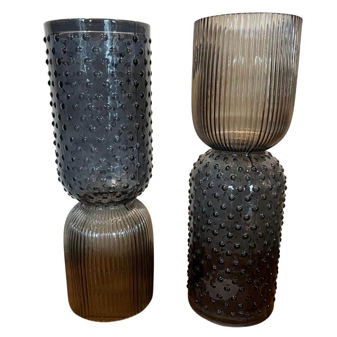 Wazon wykonany jest ze szkła w grafitowym odcieniu, z wyraźnie zaznaczoną fakturą. Jedna część posiada pionowe ryflowanie, druga pokryta jest regularnymi wypukłościami, co nadaje całości dekoracyjny, ale stonowany charakter.