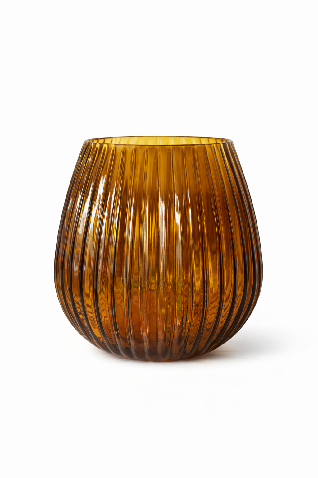 Stylowy wazon wykonany ze szkła wyróżnia się ciepłym, bursztynowym kolorem oraz dekoracyjną ryflowaną powierzchnią, która pięknie załamuje światło. Dzięki temu wazon zyskuje wyjątkową głębię i elegancki charakter.
